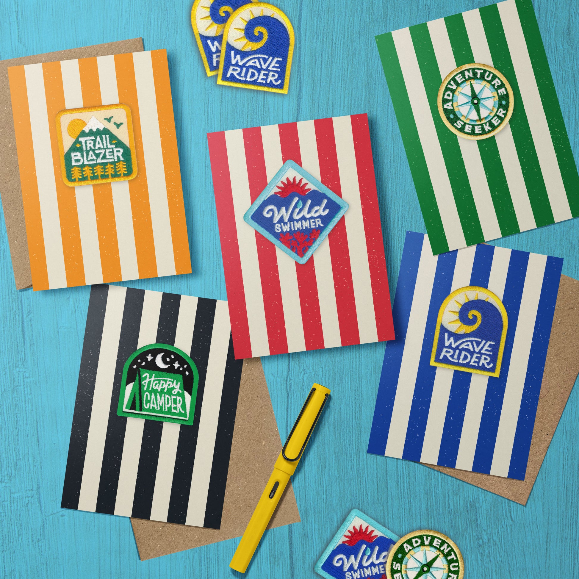 Greeting card with removable embroidered patch made from recycled thread. The eco-friendly badge comes with an iron-on backing so it can be easily attached to backpacks, jackets or swim towels.