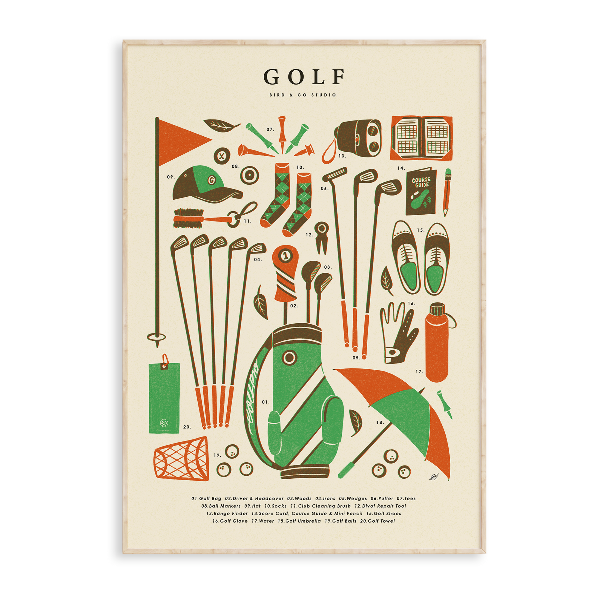A contemporary art print every golfer needs in their home (or clubhouse!). Not only does it act as a handy check list when packing for a round or golf holiday, but it also brightens your walls and reminds you of your favourite activity.